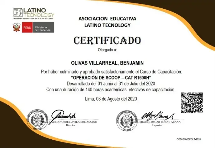 Este es el convenio establecido entre Perforaciones Diamantinas SAC y Latino Tecnology, que nos permite brindar una amplia gama de cursos en Maquinaria Pesada Minera con Certificados a nombre de la nación.