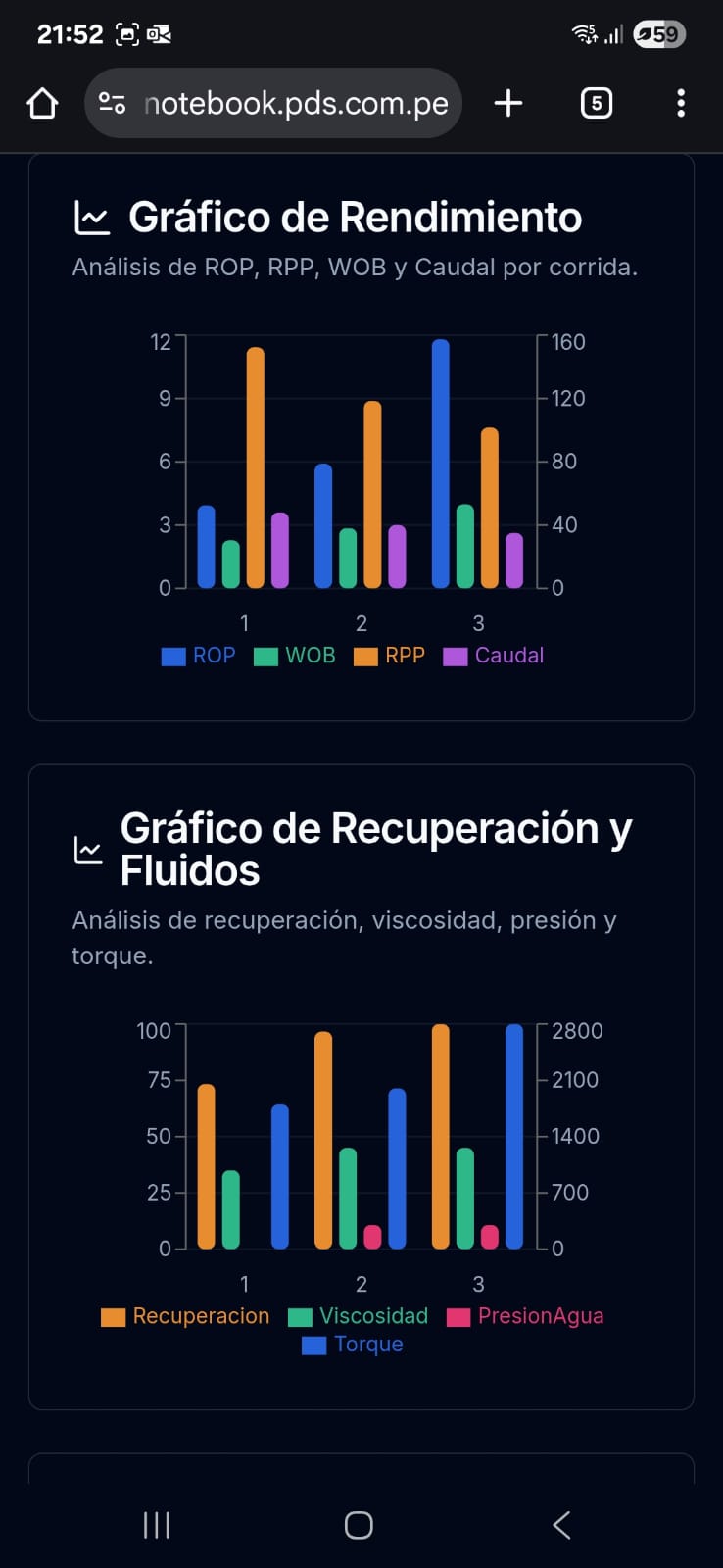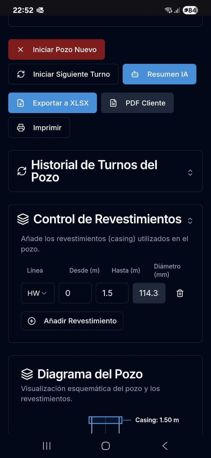 ⏱️ Optimización del Tiempo: La aplicación realiza automáticamente los cálculos de ROP, RPP, WOB, Caudal, recuperación y otros KPIs en tiempo real, eliminando la necesidad de herramientas adicionales.